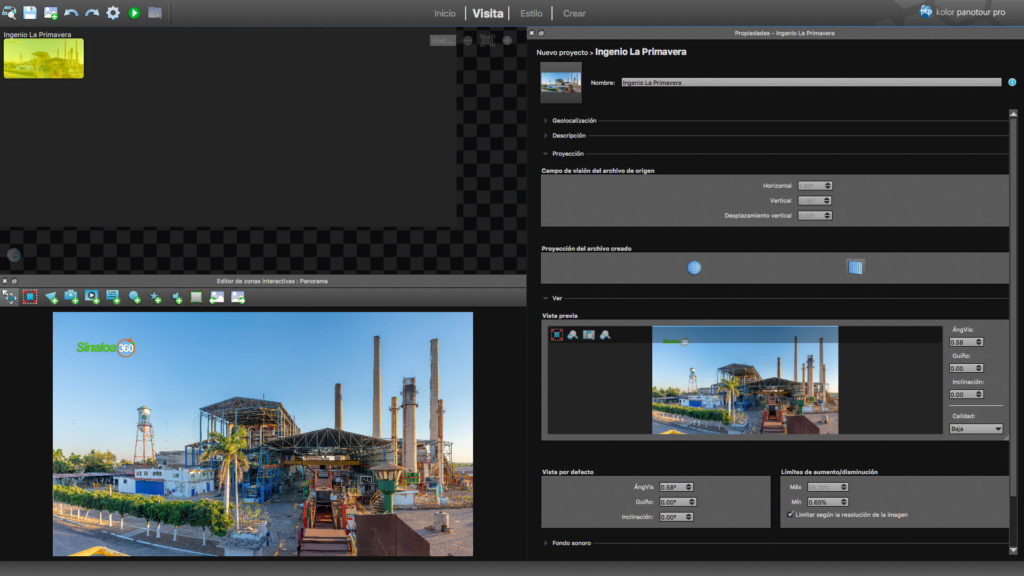 El archivo final ingenio-la-primavera.tif tiene un peso de 2.84 GB y para poder verlo con fluidez en un monitor, se requiere un software como Panotour-Pro. Este programa procesa imágenes esféricas y planas generando “teselas”, o sea que la enorme imagen del Ingenio La Primavera, la divide en imágenes mucho más pequeñas para su fácil visualización inclusive en teléfonos celulares.