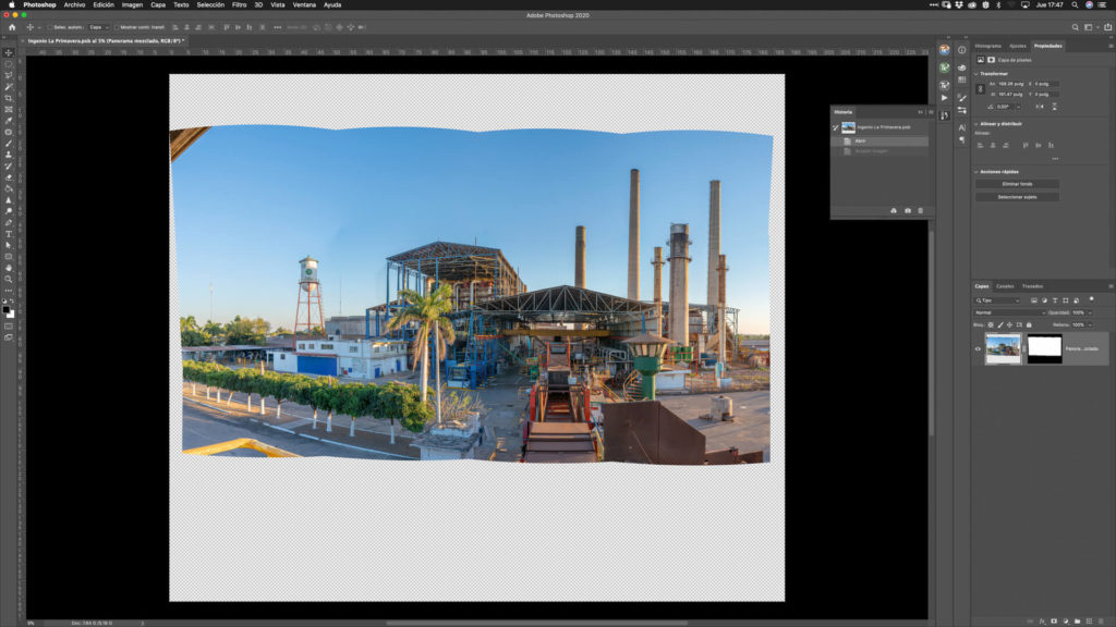 En Photoshop hacemos el recorte y los ajustes por zonas de la fotografía panorámica, así como la limpieza de las manchas que genera el sensor sucio de la cámara fotográfica.