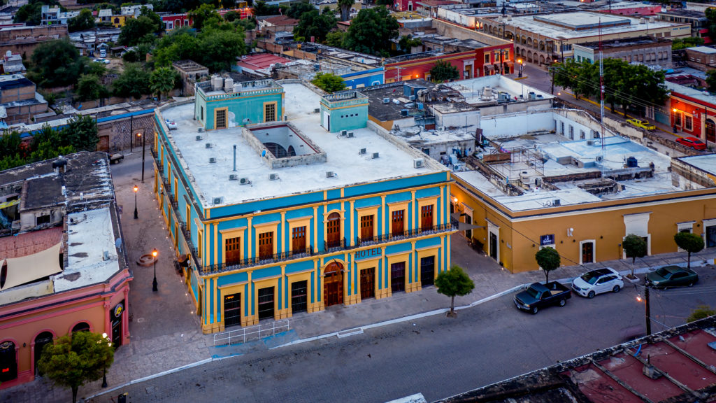 Fotografía Panorámica Aérea de la Plaza de Armas en el Centro Histórico del Pueblo Mágico de El Fuerte.